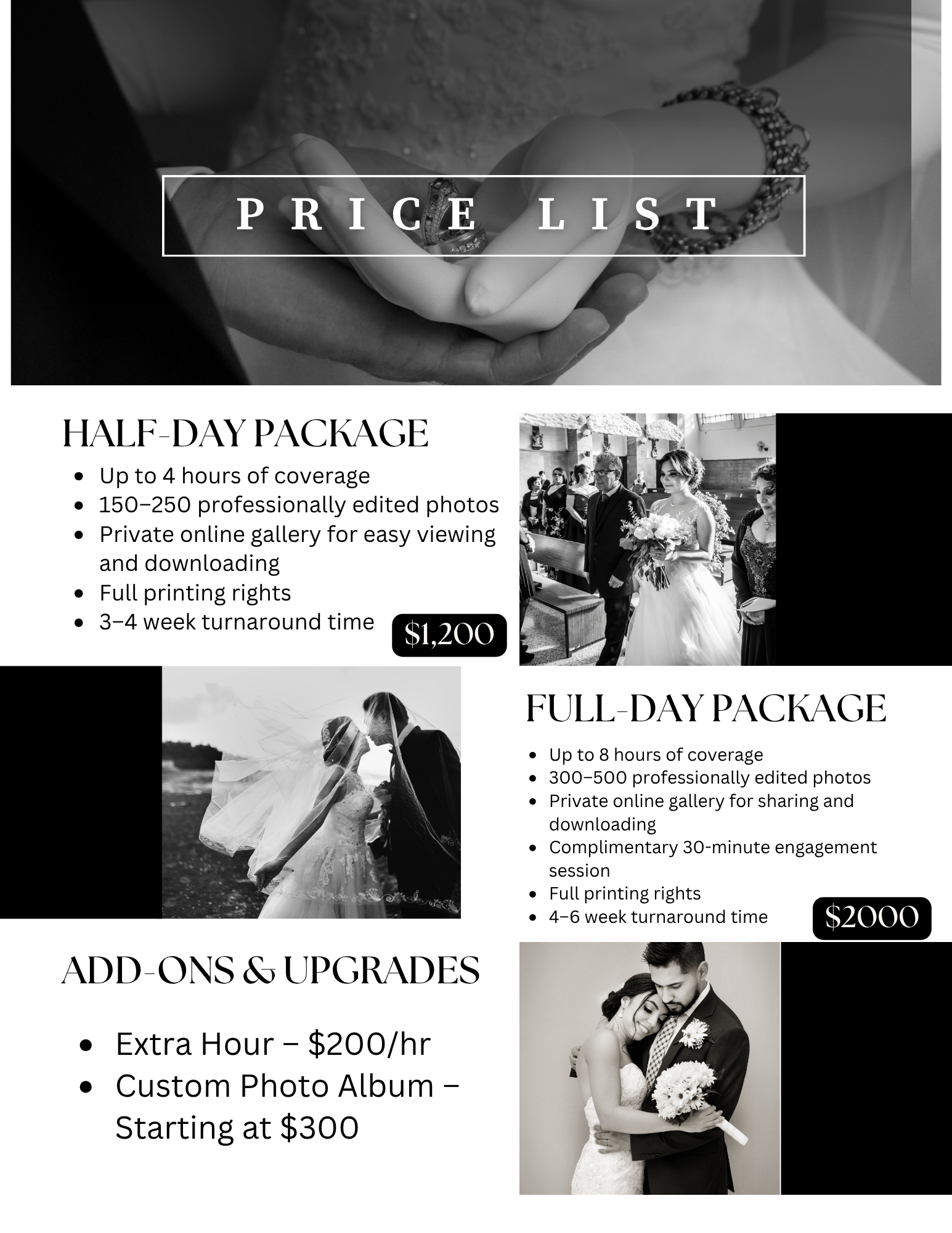 This package covers everything from the ceremony to portraits and the early part of your reception. Ideal for couples who want high-quality coverage of the most important parts of their day without booking full-day services.